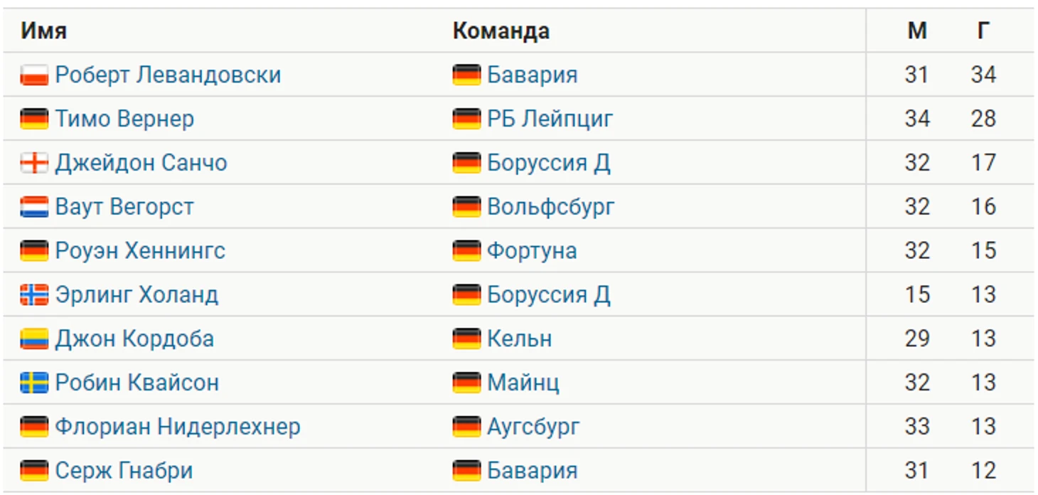 Вторую строчку в списке бомбардиров занял нападающий «Лейпцига» Тимо Вернер – 28 голов в 34 матчах. Сегодня он сделал дубль в ворота «Аугсбурга» (2:1). Подробнее его показатели можно изучить здесь.