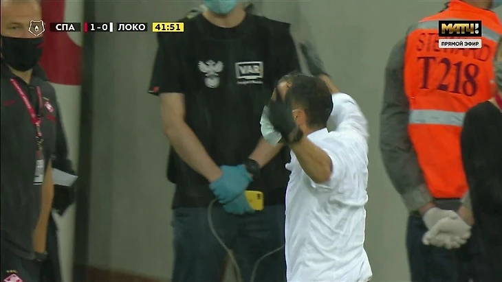 Тренер не успокоился и, покидая поле, крайне эмоционально жестикулировал, размахивал руками, отталкивал находившихся рядом с ним людей.