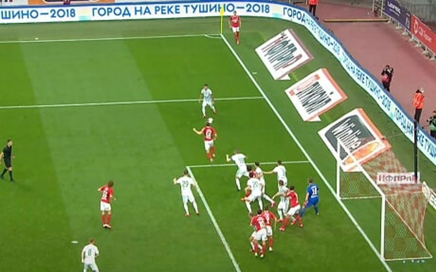 На 26-й минуте защитник красно-белых Айртон упал в штрафной грозненцев, и судья Алексей Сухой назначил пенальти, но после консультации с видеоассистентом он отменил это решение, так как фол на бразильце был до линии штрафной.
