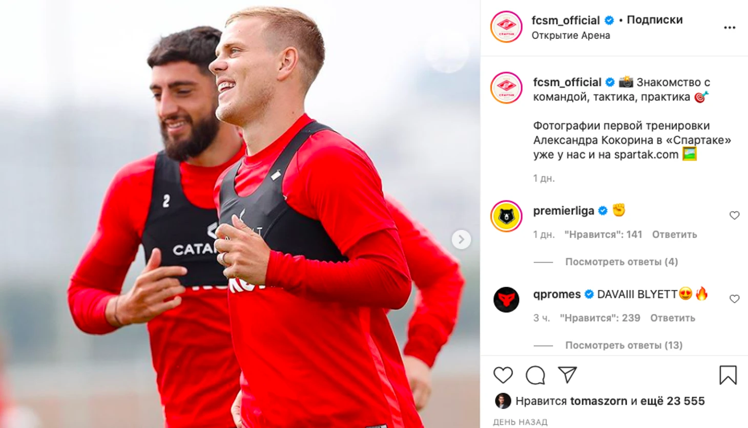 Хавбек прокомментировал фото Кокорина с первой тренировки в команде, которые опубликованы в инстаграме красно-белых.