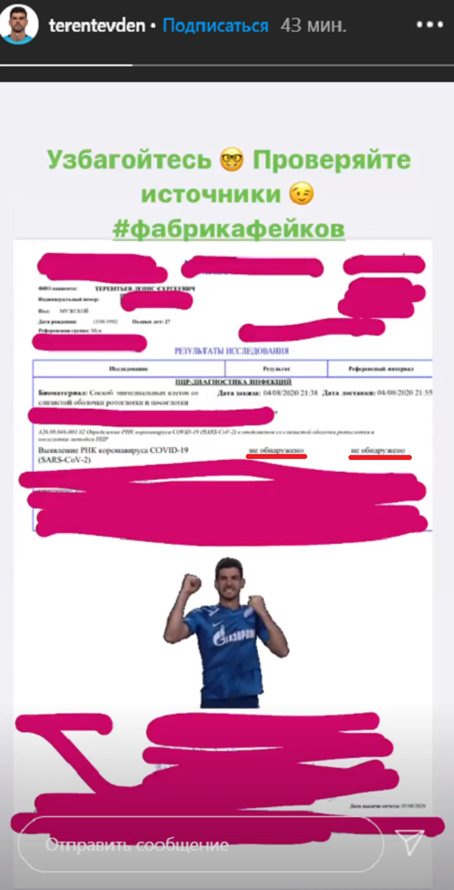Защитник «Зенита» Денис Терентьев опубликовал в инстаграме результаты своего теста на коронавирус.