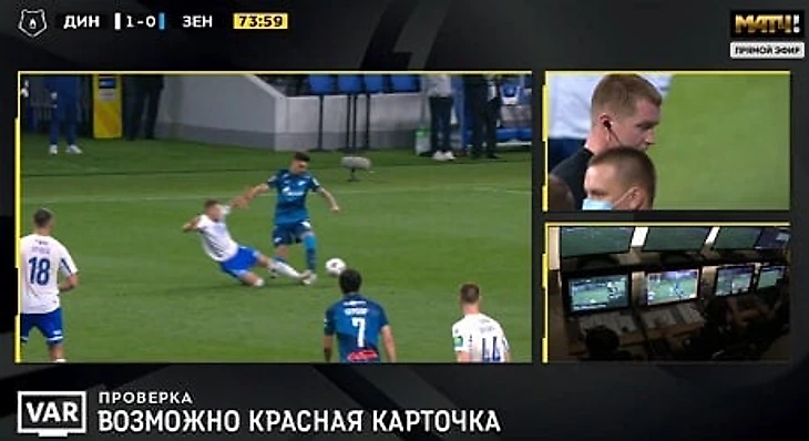 Изначально судья Станислав Васильев показал желтую карточку, но после просмотра момента с помощью ВАР изменил решение и удалил игрока.