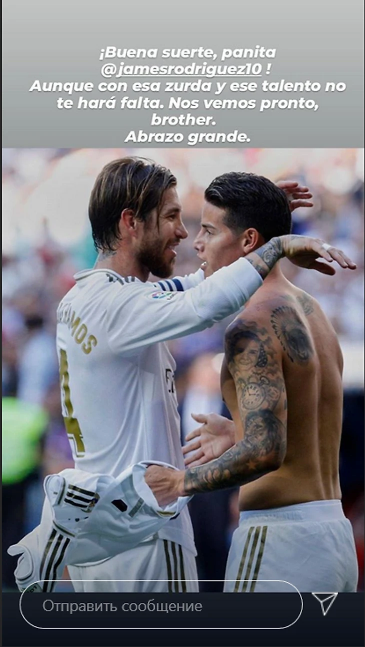 Защитник «Реала» Серхио Рамос попрощался с хавбеком Хамесом Родригесом, перешедшим в «Эвертон».