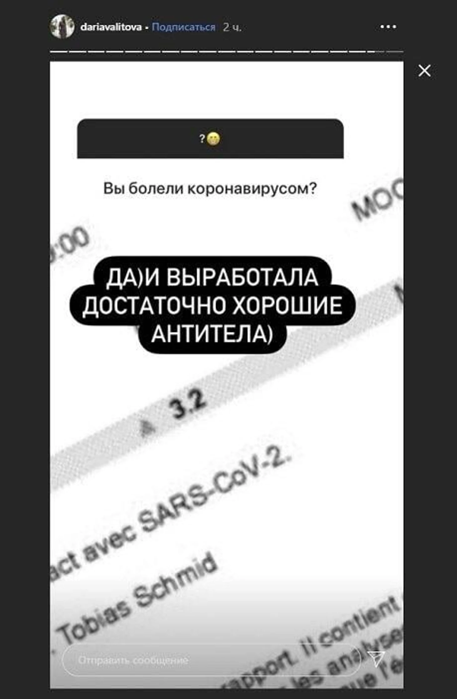 «Да. И выработала достаточно хорошие антитела», – ответила Валитова на вопрос в инстаграме о заболевании.