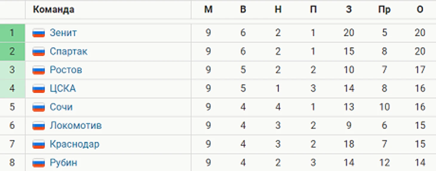 «Зенит» и «Спартак» лидируют в РПЛ с 20 очками после 9 туров, «Ростов» отстает на 3 очка