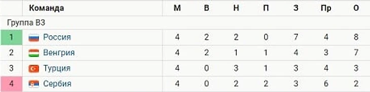 Венгрия – на 2-м месте с 7 очками, Турция – на 3-й строчке с 3 баллами, Сербия – на 4-й позиции с 2 очками.
