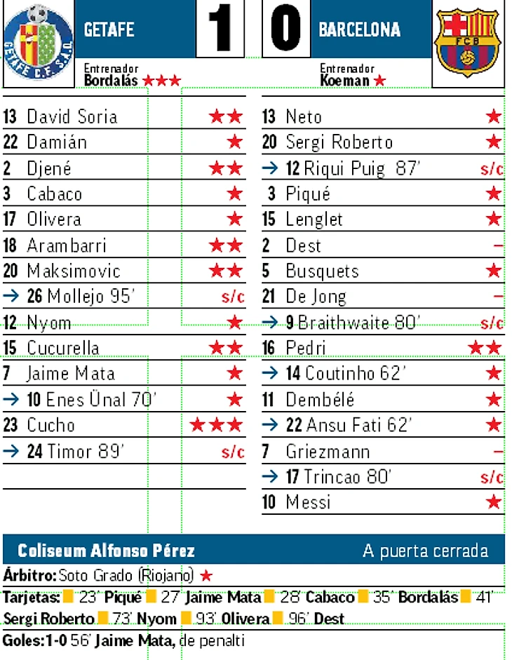 Мадридское издание Marca поставило неудовлетворительную оценку практически всем игрокам «Барселоны» за матч 6-го тура Ла Лиги с «Хетафе» (0:1).