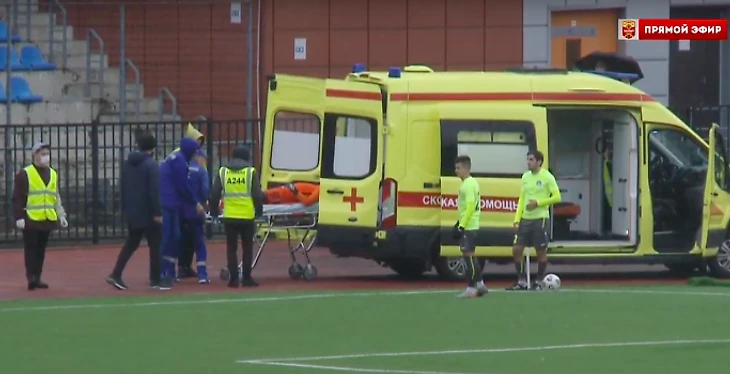 На 21-й минуте матча голкипер получил удар коленом в голову и был госпитализирован. Его увезли на скорой.
