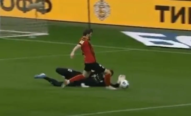 Однако судья обратился к ВАР, несколько минут смотрел повтор и принял решение отменить пенальти и показать желтую карточку Мирзову за симуляцию.