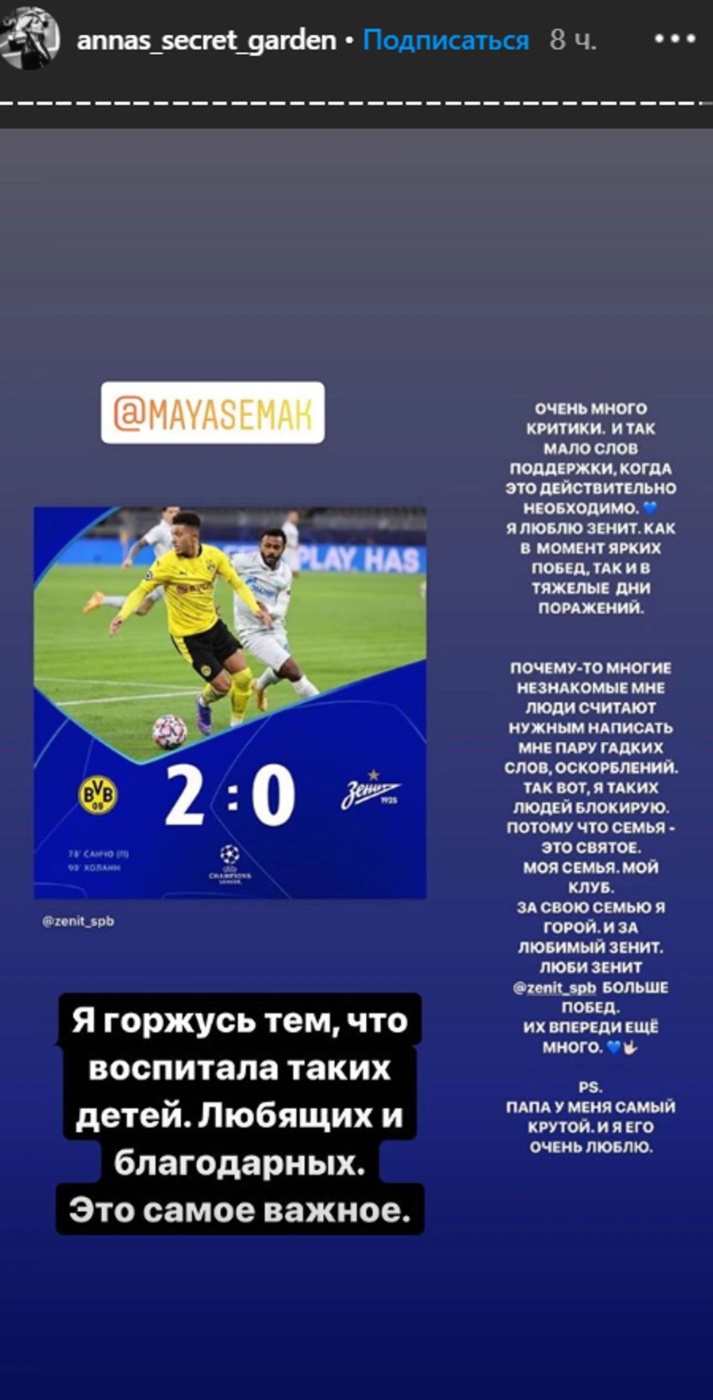 Майя Семак, дочь главного тренера «Зенита» Сергея Семака, после поражения петербуржцев от дортмундской «Боруссии» (0:2) в Лиге чемпионов опубликовала пост в поддержку отца и клуба.
