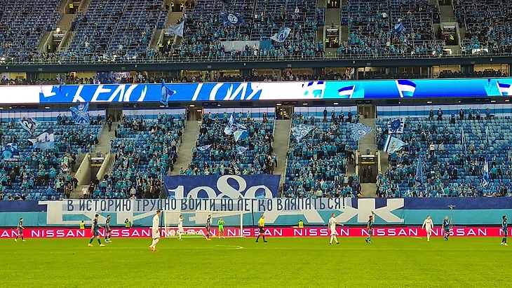 Болельщики питерской команды подготовили баннер с цитатой недавно скончавшегося сатирика Михаила Жванецкого: «В историю трудно войти, но легко вляпаться!»
