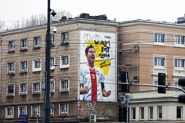 Sports.ru и Parimatch в честь победы Левандовского арендовали на месяц стену одного из домов в центре Варшавы и попросили местного художника нарисовать граффити в качестве подарка игроку.