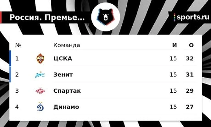 «Зенит» занимает 2-е место с 31 баллом, «Спартак» – на 3-м месте с 29 очками.
