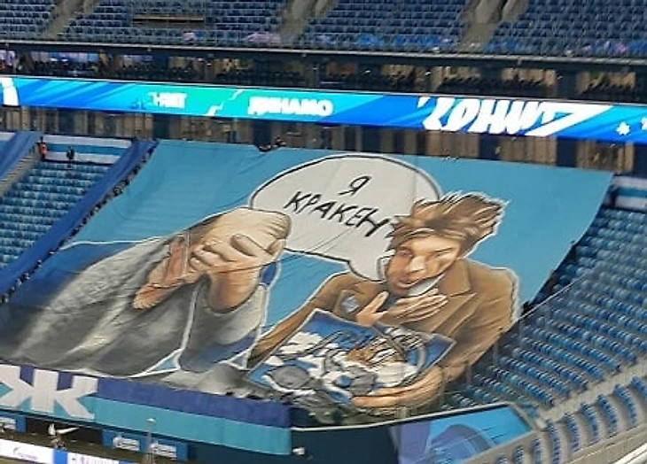 На баннере изображены профессор Преображенский и Шариков. Шариков, на одежде которого нарисована эмблема московского клуба, держит в руках картину с кораблем, который топит Кракен.
