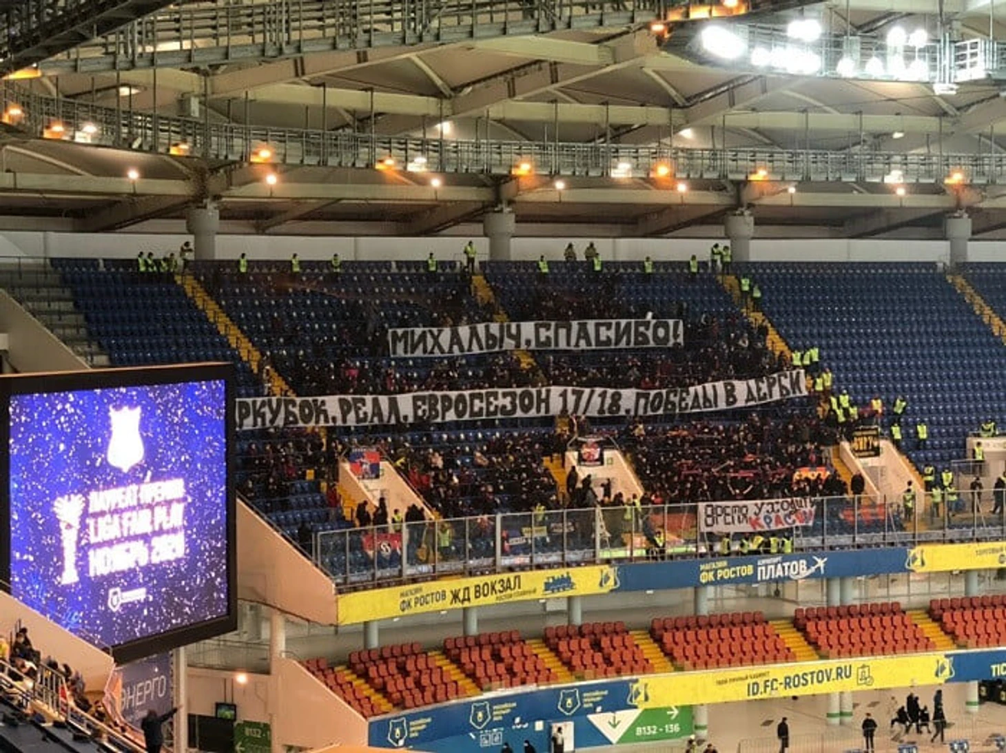 Фанаты вывесили баннеры с таким текстом: «Михалыч, спасибо! Суперкубок, «Реал», евросезон-17/18, победы в дерби. Время уходить красиво».