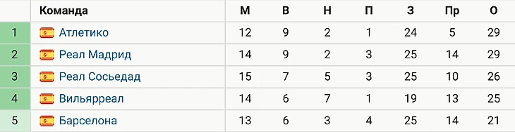 Лидирует «Атлетико», который набрал столько же очков, но имеет преимущество по дополнительным показателям и при этом провел на две игры меньше.