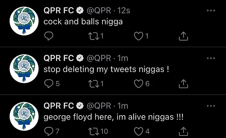 Твиттер «КПР» взломали и опубликовали расистские посты со словом «ниггер»