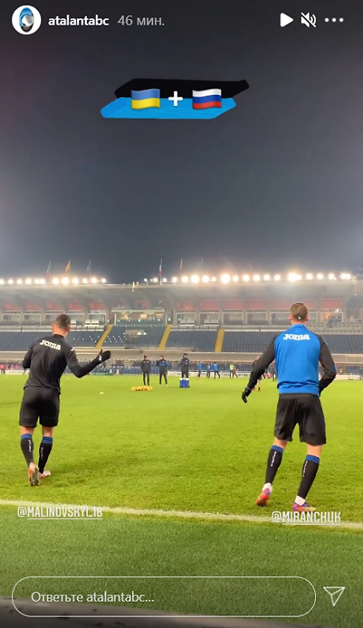 В аккаунте бергамасков выложили видео с упражнениями игроков, подписав произошедшее эмоджи с флагами стран, которые представляют игроки, – России и Украины.