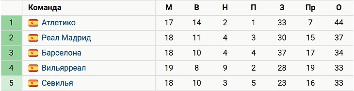 «Атлетико» опережает идущий вторым «Реал» на семь очков и при этом имеет одну игру в запасе. Отрыв от «Барселоны», занимающей третье место, составляет 10 очков.