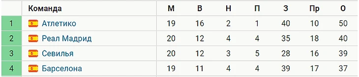 «Атлетико» лидирует в таблице чемпионата Испании с 50 очками, опережая «Реал», идущий вторым, на 10 очков, и при этом имея матч в запасе.