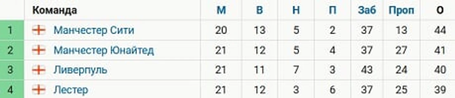 Лидирует в АПЛ «Манчестер Сити» – на счету горожан 44 балла в 20 матчах. На втором месте идет «Манчестер Юнайтед» – 41 очко после 21 игры.