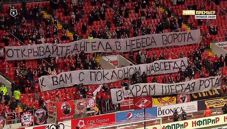 Фанаты «Спартака» на домашнем матче 20-го тура РПЛ с «Рубином» (0:2) вывесили баннер в память о шестой роте 104-го парашютно-десантного полка 76-й (Псковской) воздушно-десантной дивизии.