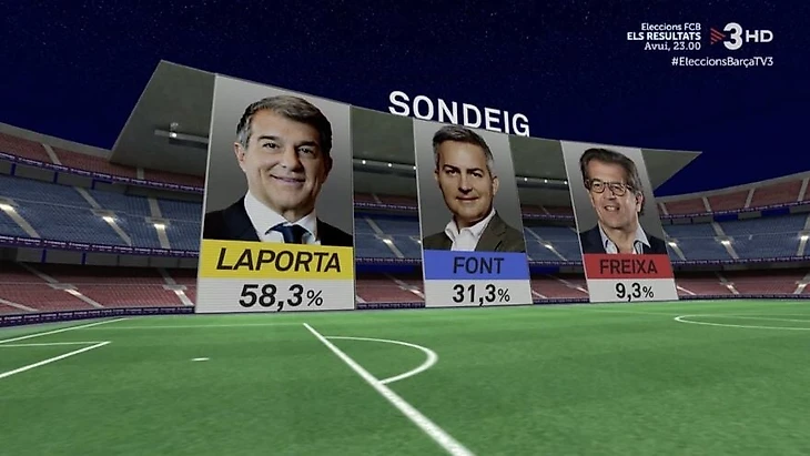 По результатам опросов 58,3% участников проголосовали за экс-президента «блауграны» Жоана Лапорту, 31,3% – за Виктора Фонта, 9,3% – за Тони Фрейшу. Еще 1,1% участников, вероятно, не стали отвечать.