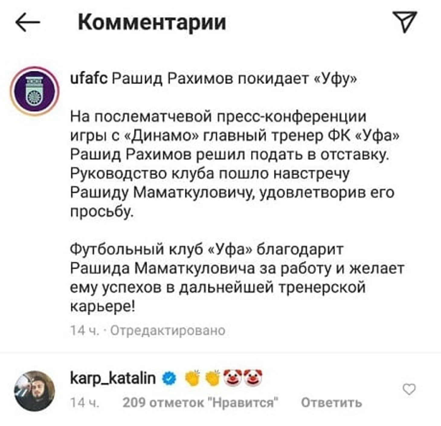 Игрок оставил комментарий с эмодзи, изображающими клоунов, под постом уфимского клуба об отставке в инстаграме.