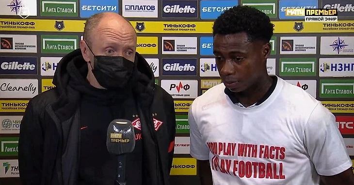 Промес в футболке с текстом «Вы играете фактами, я играю в футбол» дал интервью «Матч Премьер» в игре с «Ростовом»