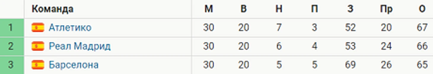 Второе место занимает «Реал» с 66 баллами, третье – «Барселона», имеющая 65 очков.