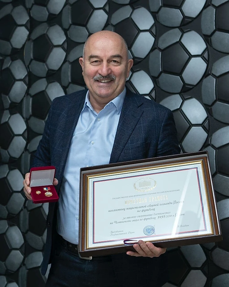 Сборная России и ее главный тренер Станислав Черчесов получили от председателя Госдумы РФ Вячеслава Володина почетную грамоту и медаль «За высокие спортивные достижения на чемпионате мира по футболу 2018 года».