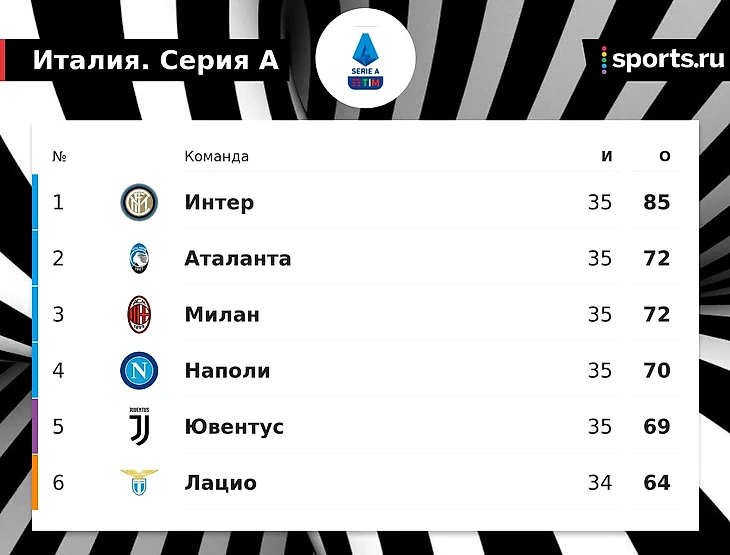 Лидирует в чемпионате Италии «Интер», досрочно ставший чемпионом. Второе место занимает «Аталанта» (72 очка), третье – «Милан» (72 очка), четвертое – «Наполи» (70 баллов).