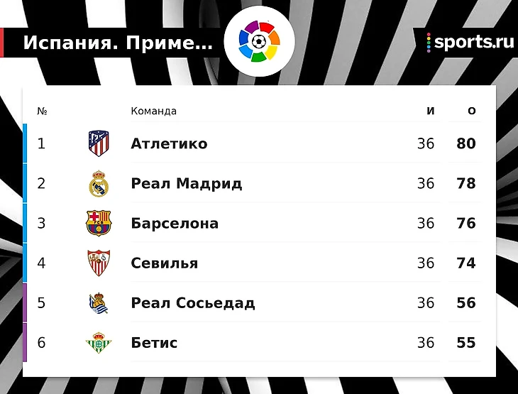 За два матча до конца чемпионата в таблице лидирует «Атлетико», набравший 80 очков. «Реал» отстает от команды Диего Симеоне на два балла, «Барселона» с 76 очками идет третьей.