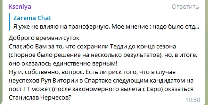 «Есть ли риск того, что в случае неуспехов Руя Витории в «Спартаке» следующим кандидатом на пост главного тренера может (после закономерного вылета с Евро) оказаться Станислав Черчесов?» – задали вопрос Салиховой в телеграм-канале.