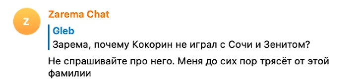 Один из подписчиков ее телеграм-канала спросил: «Зарема, почему Кокорин не играл с «Сочи» и «Зенитом»?»