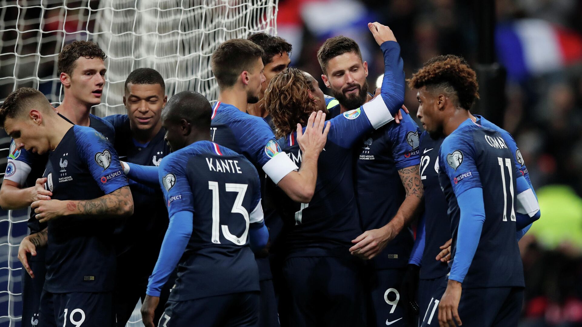 Льорис (вр), Варан (пз), Лангле (цз), Кимпембе (лз), Канте (цп), Погба (цп), Павар (пп), Рабьо (лп), Мбаппе (фрв), Гризманн (цап), Бензема (фрв).