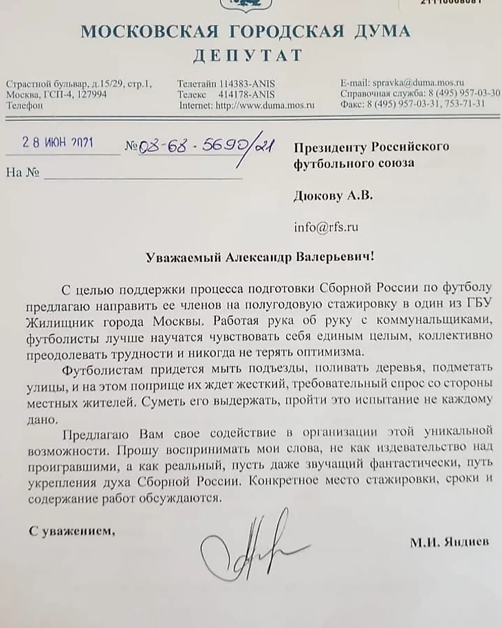 Депутат Московской городской думы Магомет Яндиев написал письмо главе РФС Александру Дюкову.