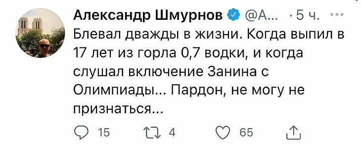 «Блевал дважды в жизни. Когда выпил в 17 лет из горла 0,7 водки, и когда слушал включение Занина с Олимпиады... Пардон, не могу не признаться...» – написал Шмурнов.