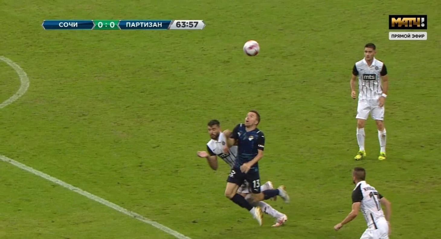 Судья дал «Сочи» пенальти за фол «Партизана» за пределами штрафной. Нобоа забил