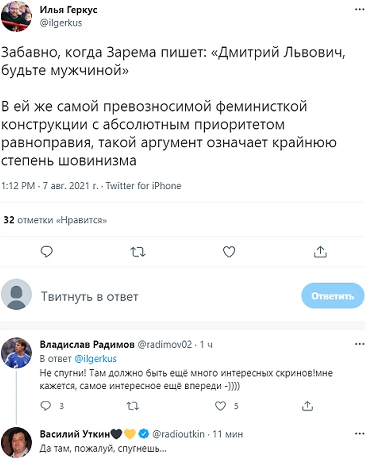 «Забавно, когда Зарема пишет: «Дмитрий Львович, будьте мужчиной». В ей же самой превозносимой феминистской конструкции с абсолютным приоритетом равноправия, такой аргумент означает крайнюю степень шовинизма», – поделился мнением Геркус.