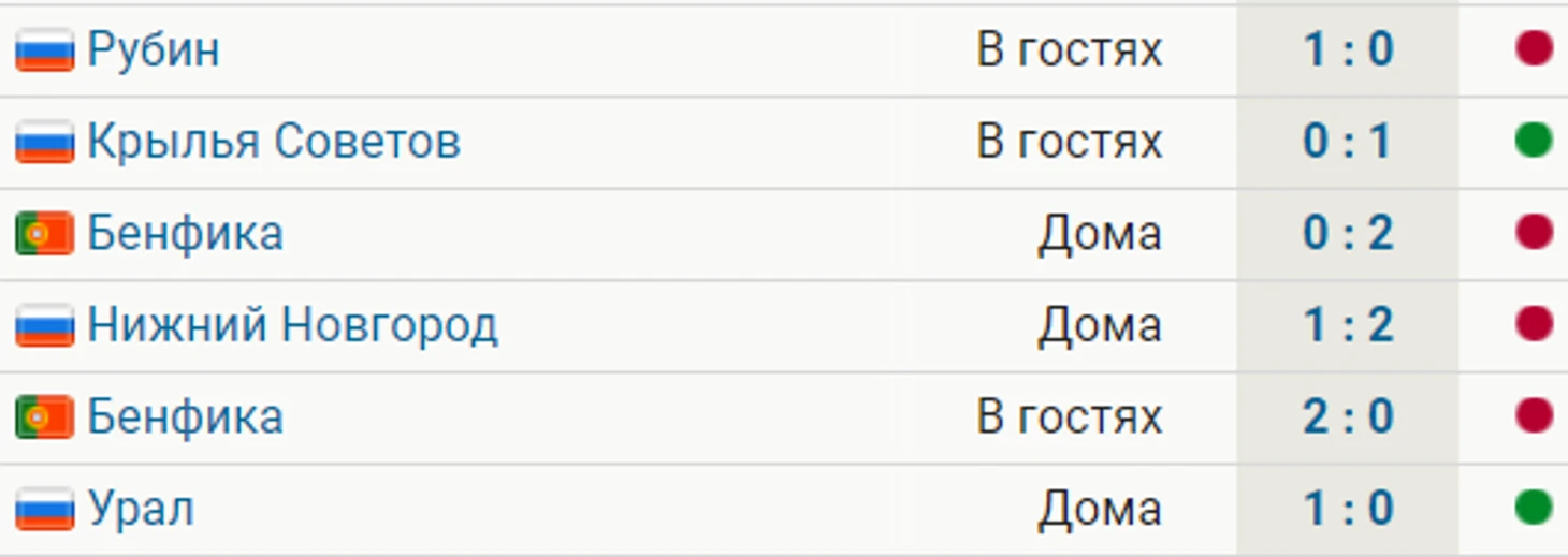 Остальные четыре матча завершились поражениями – двумя от «Бенфики» в Лиге чемпионов, по одному – от «Рубина» и «Нижнего Новгорода».