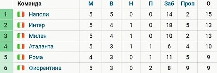 Неаполитанцы лидируют в таблице, набрав 15 очков. У «Интера» и «Милана» – по 13.