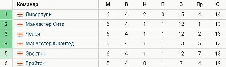 «Ливерпуль» лидирует в АПЛ, опережая «Сити», «Челси», «МЮ» и «Эвертон» на 1 очко. У «Брайтона» игра в запасе