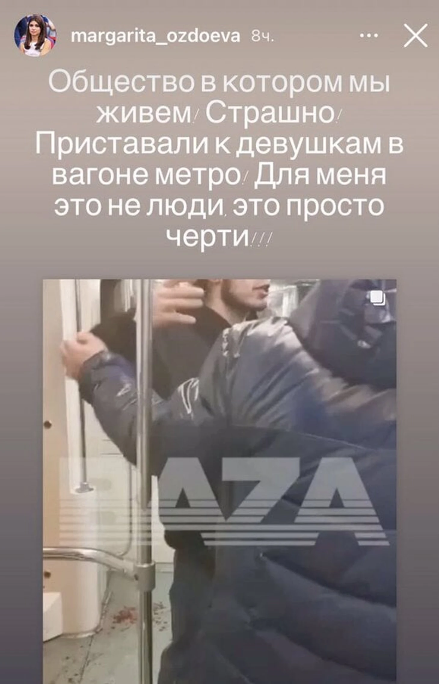 «Общество, в котором мы живем. Страшно. Приставали к девушкам в вагоне метро. Для меня это не люди, это просто черти», – написала Оздоева в сториз инстаграма.