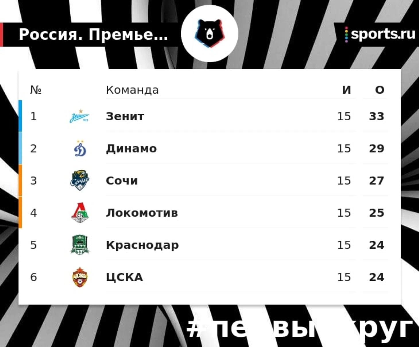 На третьей позиции идет «Сочи» (27 очков), на четвертой – «Локомотив» (25), на пятой – «Краснодар» (24), на шестой – ЦСКА (24).