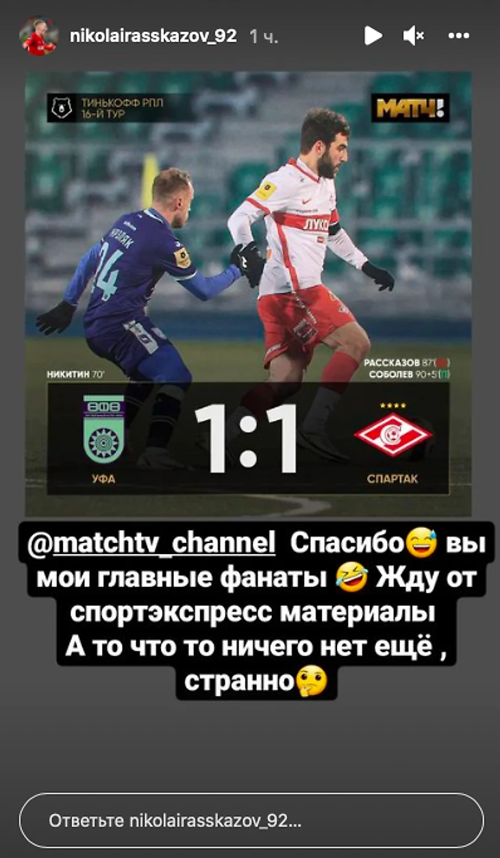 Рассказов выложил эту публикацию в историях и написал: «Матч ТВ», спасибо 😅 Вы мои главные фанаты 😂 Жду от «Спорт-Экспресс» материалы. А то что-то ничего нет еще, странно 🤔».
