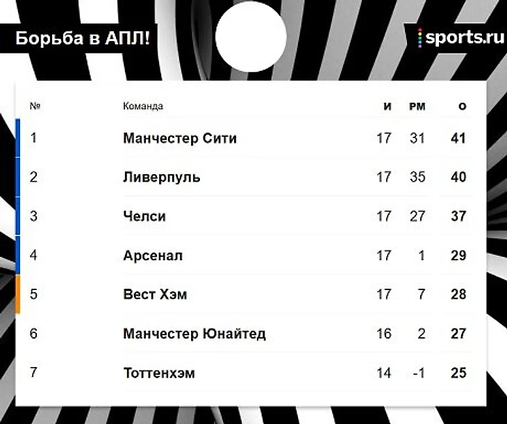 «Ливерпуль» отстает от «Сити» на 1 очко после 17 туров, «Челси» – на 4, «МЮ» – на 14 при игре в запасе
