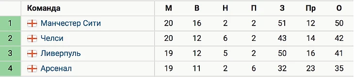 Команда Пепа Гвардиолы, набрав 50 очков в 20 играх, опережает идущего вторым «Челси» на восемь баллов. У «Ливерпуля» на девять очков меньше при игре в запасе.