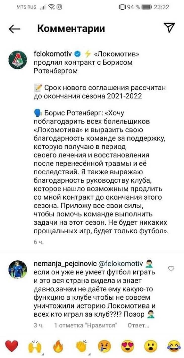 Бывший защитник «Локомотива» Неманья Пейчинович подверг критике решение клуба о продлении контракта с Борисом Ротенбергом до конца сезона.