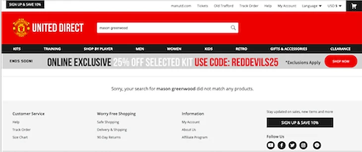 При запросе «Гринвуд» или «Мэйсон Гринвуд» в клубном интернет-магазине появляется сообщение: «Извините, по вашему запросу не найдено ни одного товара».